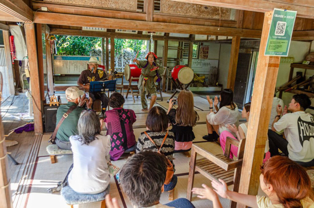 なかでも見逃せないのが、古民家のなかで開催される民謡ショーです。 石垣島出身のおばあが三線の音色に合わせて歌い踊る姿は圧巻で、一升瓶を頭に乗せて踊る芸は必見です。 観客も一緒に掛け声を出して盛り上がれる参加型のショーなので、子どもから大人まで楽しめます。