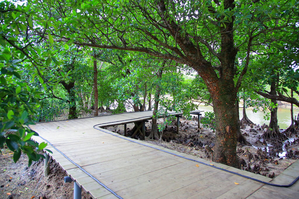 園内からマングローブの森へと続く散策路が整備されており、足元をよごすことなくマングローブ林を間近に観察できます。 ウッドデッキの上を歩きながら、カニやハゼなどの小さな生き物を見つけることもできます。